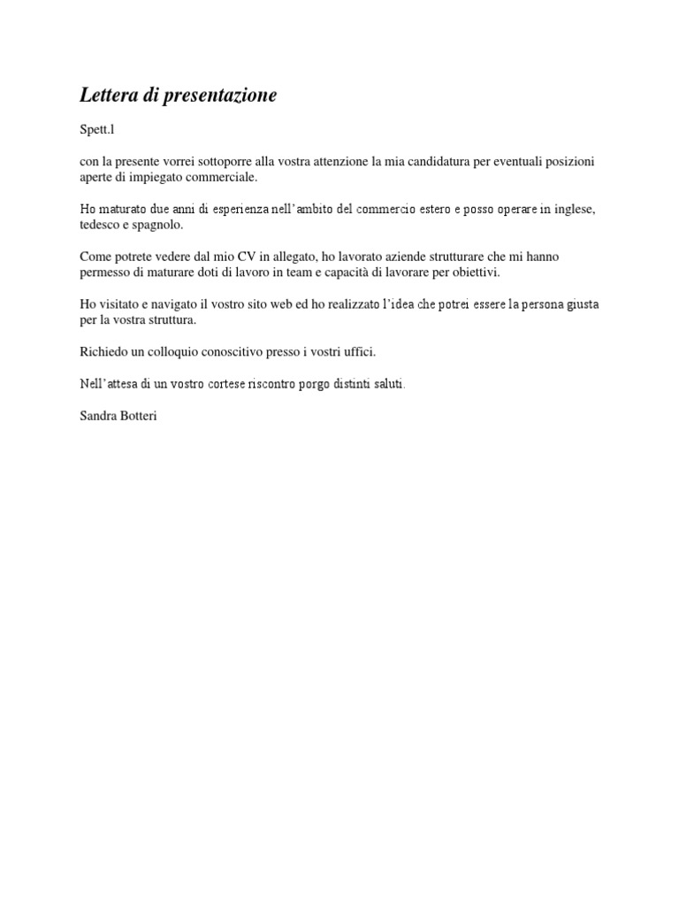 Esempio lettera di presentazione in tedesco. Curriculum vitae tedesco: Come scrivere il perfetto Lebenslauf tedesco ... Il curriculum vitae è un elenco preciso e breve della tua istruzione e della tua esperienza professionale. I testi continui nel curriculum vitae tedeschi sono insoliti e fanno parte della lettera di presentazione. Il tuo CV tedesco deve essere adattato individualmente alla posizione pubblicizzata. Massimo 2 pagine! Come scrivere una lettera in tedesco L'aspetto più importante della scrittura di lettere in tedesco è determinare se sarà una lettera formale o casuale. In tedesco, ci sono molte più disposizioni quando si scrive una lettera formale. Non rispettando queste formalità, rischi di sembrare scortese e impertinente. Quindi, per favore, tieni a mente quanto segue quando scrivi una ... Traduzione di "lettera di presentazione" in tedesco - Reverso Willkommensbrief m. Motivationsschreiben. Si prega di inviare il vostro curriculum e lettera di presentazione a. Bitte reichen Sie Ihren Lebenslauf und Ihr Anschreiben an. Usalo per la lettera di presentazione. Du kannst es für dein Anschreiben nutzen. Se la richiesta viene approvata, si riceverà una lettera di presentazione che conferma l ... Lettera motivazionale in tedesco: come scriverla al meglio 20 Marzo 2021. Sia per iscriversi all'università che per trovare lavoro in Germania, può darsi che ti venga richiesta la lettera di presentazione, anche chiamata lettera motivazionale - Motivationsschreiben, in tedesco. È un documento in cui ti presenti e dimostri di essere il/la candidato/a ideale, sia per capacità che per motivazione.