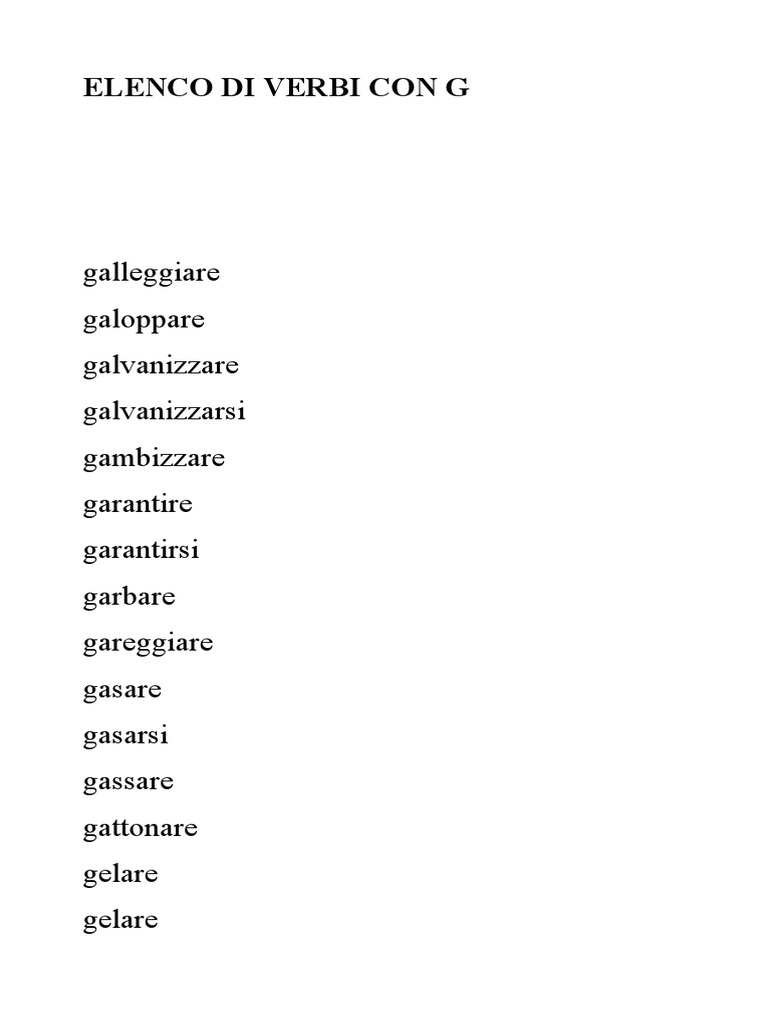Verbi con la lettera g. Vocabolario: cerca tra le parole con la lettera G. - Virgilio gabelliere gabellini gabellotto gabinetti gabinetto gadget gadolinio gaelico scozzese gaffa gaffe gag gaggia gagliarda gagliardamente gagliarde gagliardi gagliardo gaglioffo gaia gaiezza gaio gal gala galante galantemente galantina galantuomo galassia galassie galatei galateo galattoxilomannano galaverna galenica galenico galeone galeoni galeotto Tutti i verbi francesi con la lettera g - LinguaBooster G; Tutti i verbi francesi con la lettera g. â à é ê è ë î ï ô û ù ü ÿ œ æ. regolare irregolare ausiliare avoir primo gruppo terzo gruppo secondo gruppo ausiliare être Verbi italiani con la lettera g in tutti i modi e tempi verbali Verbi italiani con la lettera g in tutti i modi e tempi verbali con esempi ed esercizi. LinguaBooster LB imparare una lingua straniera. Impara Italiano ... Verbi che iniziano con la G - la lista completa La lista dei verbi con la G gabbare gabellare gagnolare gallare galleggiare gallicizzare gallonare galoppare galvanizzare gambettare gambizzare gangrenare gannire garantire garbare garbugliare gareggiare garentire gargarizzare garnettare garrire garrotare garrottare garzare garzoneggiare gasare gasificare gassare gassificare gastigare gatteggiare